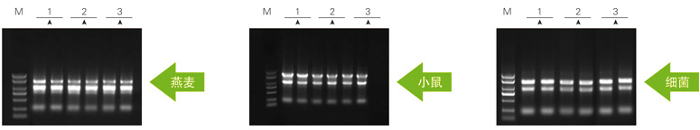 以上參考圖分別取50mg燕麥葉片,20mg小鼠肝臟和1ml細菌DH5α菌液各數(shù)份,組織進行液氮研磨處理,菌液離心收集細胞后,分別加入1ml Zomanbio RNApure 和 T、I公司相應(yīng)產(chǎn)品,按各自說明書進行RNA提取。洗脫體積分別為80μl、100μl、60μl。RNA電泳上樣量分別為5μl,1%瓊脂糖凝膠電泳。