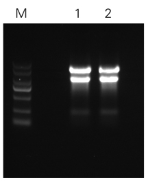 注解: 樣品:寄生曲霉 使用液氮研磨后的50 mg樣品,100μl洗脫 M:DL2000(ZOMANBIO) 1,2:莊盟ZP431提取結果 |