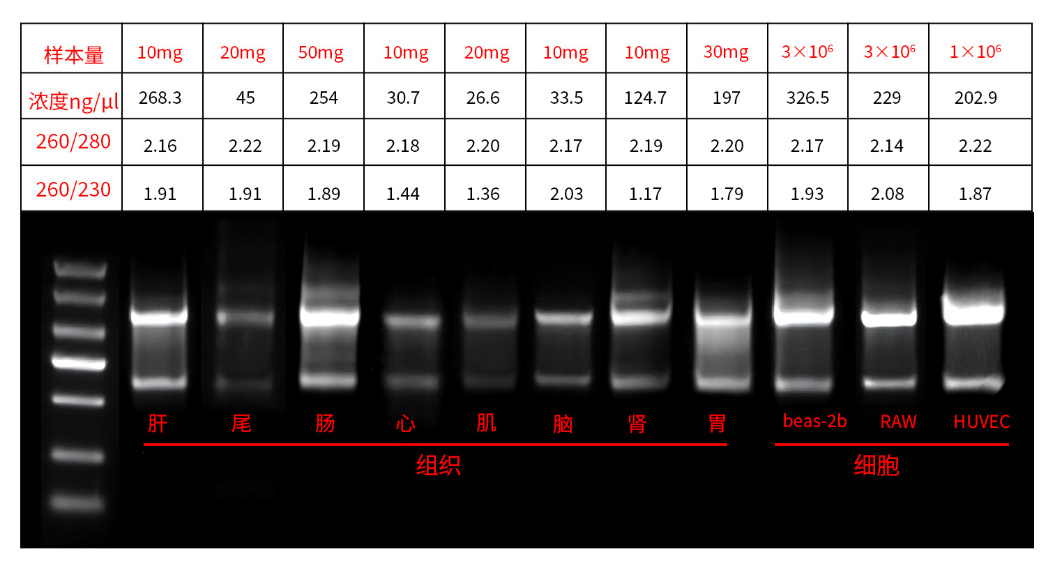 注:使用ZP441對不同組織、細胞樣本提取的RNA進行瓊脂糖凝膠電泳檢測。M:Maker DL2000 洗脫體積:50ul 上樣量:2ul。