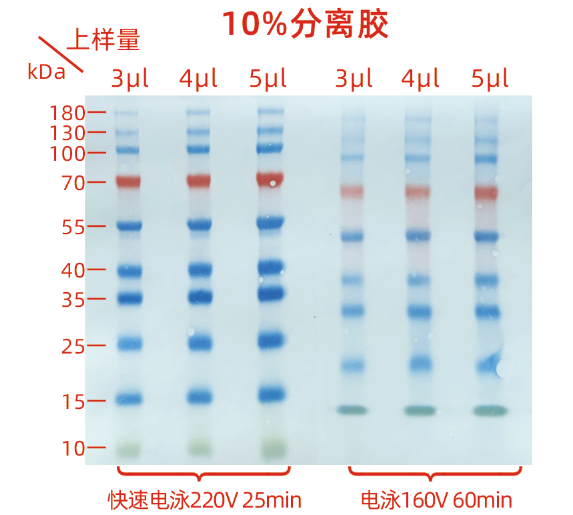 本產(chǎn)品由10-180 kDa的10種純化的天然蛋白混合而成,其中70 kDa為橙紅色蛋白條帶,10 kDa為綠色蛋白條,方便判斷各個條帶的準確位置。產(chǎn)品適合作為SDS-PAGE電泳時變性蛋白樣品的分子量參照,并可實時觀察蛋白樣品的電泳分離狀況,也可用于檢測Western blot的轉(zhuǎn)膜效率。由于共價結(jié)合的染料會影響蛋白質(zhì)分子的電泳遷移率,本產(chǎn)品僅適于粗略地估計目的蛋白樣品的分子量。