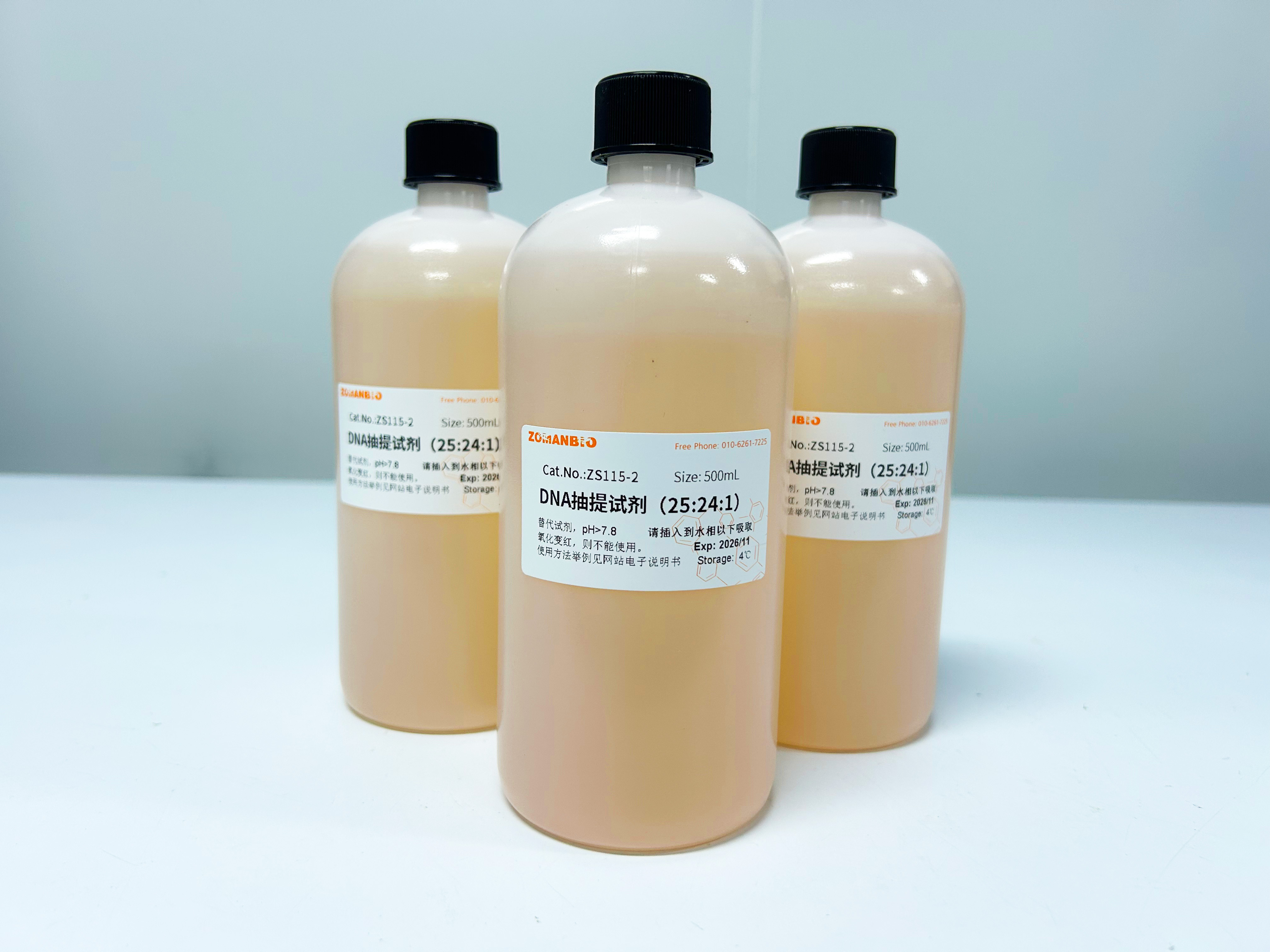 通過DNA抽提溶液(25:24:1)抽提作用,可去除樣品中蛋白、多糖、酚類等雜質(zhì),再加入乙醇或異丙醇等沉淀核酸即可使DNA分離出來。該抽提溶液可以使蛋白質(zhì)變性,同時(shí)利用RNA、DNA、蛋白質(zhì)三者的性質(zhì)差別來分離DNA。抽提離心后的上層為含DNA的水相,中間為變性蛋白相,下層為有機(jī)溶劑相。該試劑僅用于科研領(lǐng)域,不適用于臨床診斷或其他用途。