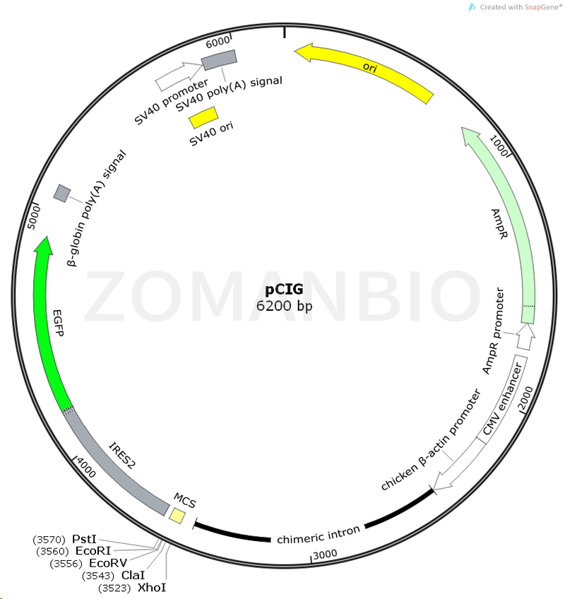 pCIG質(zhì)粒是一個哺乳細胞過表達載體,CAG啟動子驅(qū)動目的基因的表達。 質(zhì)粒只保證關鍵序列正確,不保證表達效果。