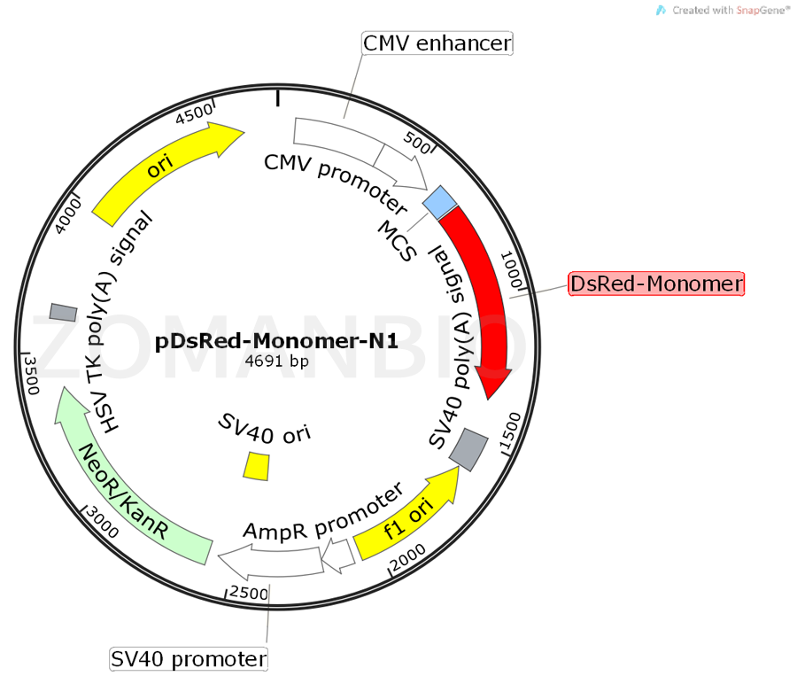 pDsRed-Monomer-N1 is a mammalian expression vector that encodes DsRed-Monomer (DsRed.M1), a monomeric mutant derived from the tetrameric Discosoma sp. red fuorescent protein DsRed. DsRed-Monomer contains forty-fve amino acid substitutions (listed on page 2). When DsRed-Monomer is expressed in mammalian cell cultures, red fuorescent cells can be detected by either fuorescence microscopy or fow cytometry 12–16 hr after transfection (DsRed-Monomer excitation and emission maxima = 557 nm and 592 nm, respectively). The DsRed-Monomer coding sequence is human codon-optimized for high expression in mammalian cells.