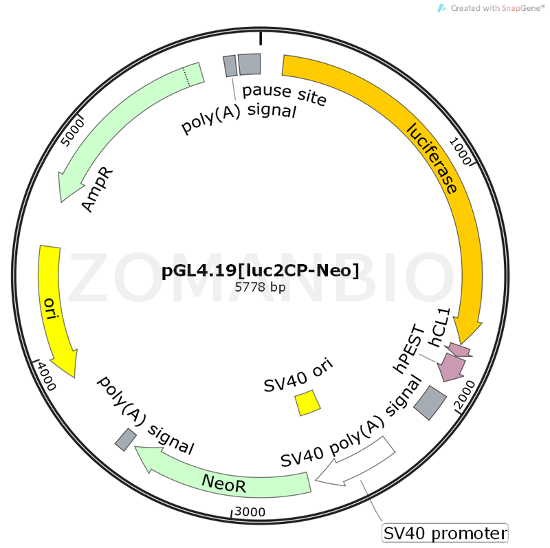 The pGL4.19[luc2CP/Neo] Vector encodes the luciferase reporter gene luc2CP (Photinus pyralis) and is designed for high expression and reduced anomalous transcription. This vector also contains a mammalian selectable marker for neomycin resistance in which the number of transcription factor binding sites has been reduced and mammalian codon usage optimized. This vector is engineered with fewer consensus regulatory sequences for reduced background and a decreased risk of anomolous transcription and has a synthetic reporter gene, which has been codon optimized for mammalian expression. The pGL4.19[luc2CP/Neo] Vector is a basic vector with no promoter. However, it contains a multiple cloning region that allows cloning of a promoter of choice. The luc2CP reporter gene contains two protein destabilization sequences, hCL1 and hPEST. The protein encoded by luc2CP responds more quickly and with greater magnitude to changes in transcriptional activity than the luc2 gene, its more stable counterpart.