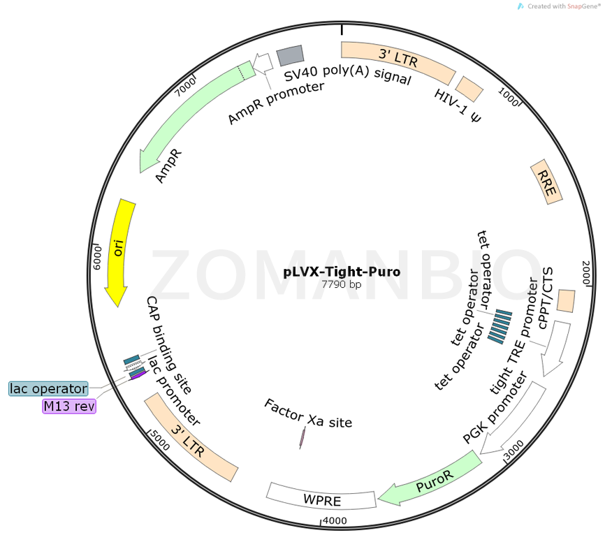pLVX緊PURO是四環(huán)素(TET)誘導,慢病毒表達載體,表達了ptight控制下一個感興趣的基因,改良的四環(huán)素反應啟動子。ptight包含一個改進的最小的CMV啟動子和一個36 bp的調(diào)控序列包含19 bp的直接重復序列七四環(huán)素。這個載體是設計用來與我們慢XTM Tet-on?先進Tet-Off?先進的誘導表達系統(tǒng)(CAT。632162號,632163)。