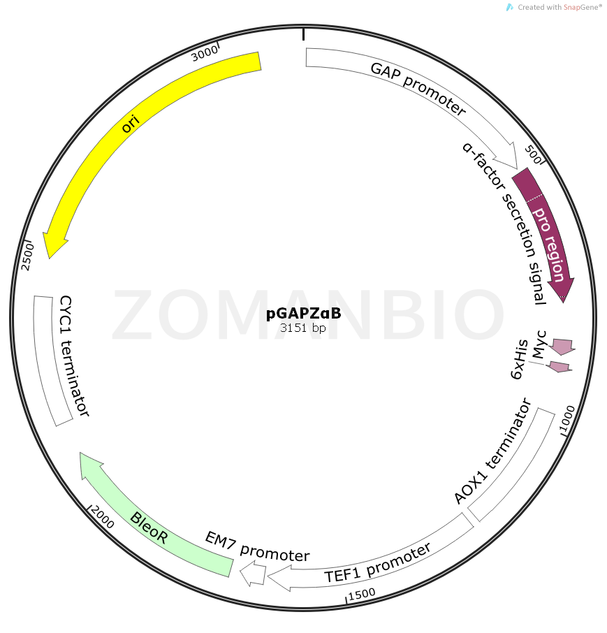 pGAPZ A,B,和C載體(2.9 KB)和pGAPZαB和C(3.1 KB)載體使用GAP啟動子在畢赤酵母中穩(wěn)定表達重組蛋白。重組蛋白表達為為帶有C-末端myc抗原表位和C端His標(biāo)簽的融合蛋白。此外,pGAPZα 表達的融合蛋白在N-端帶有釀酒酵母(Saccharomyces cerevisiae)的α-因子分泌信號肽。這兩個系列的載體都提供三個不同讀碼框的載體,以方便克隆的帶有C-端標(biāo)簽和/或N-末端分泌信號肽的載體中。
