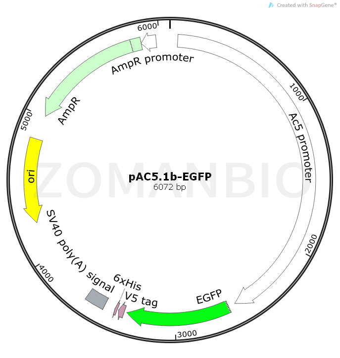 pAC5.1b-EGFP質(zhì)粒是一個昆蟲細胞組成型表達載體,Ac5啟動子驅(qū)動EGFP標簽、目的基因、Myc標簽和6×HIS標簽一起融合表達,可以與篩選載體pCoHygro或者pCoBlast共轉(zhuǎn)染,建立穩(wěn)表達細胞系。