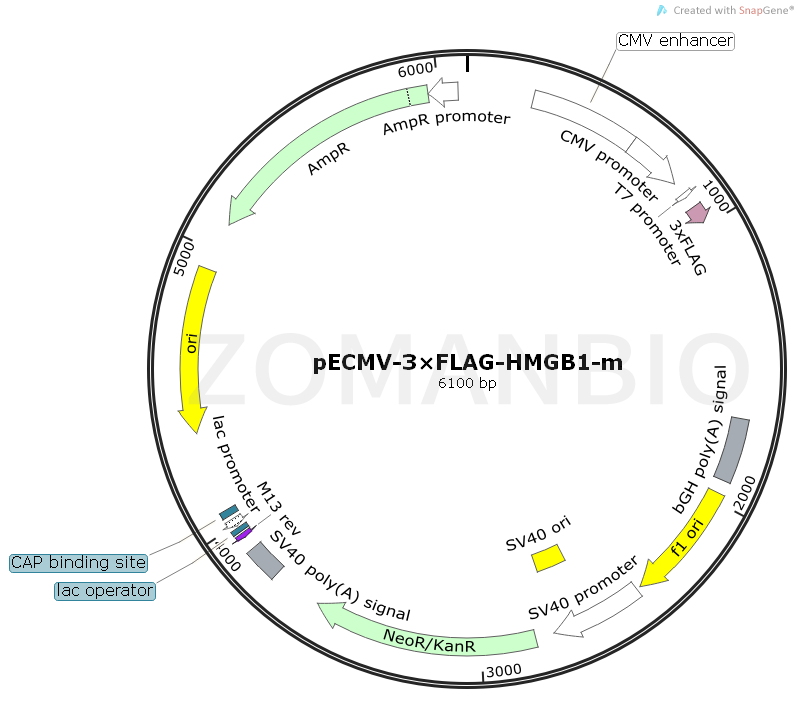 pECMV-3×FLAG-HMGB1-m質(zhì)粒是在pECMV-3×FLAG載體的基礎(chǔ)上改造而成,CMV啟動(dòng)小鼠源HMGB1基因的過(guò)表達(dá),N端的3×FLAG融合標(biāo)簽?zāi)芎芎玫谋籉LAG抗體識(shí)別。該質(zhì)??勺鳛檫^(guò)表達(dá)質(zhì)粒直接轉(zhuǎn)染哺乳細(xì)胞。質(zhì)粒本身帶有Neo篩選標(biāo)記,可用G418篩選轉(zhuǎn)染后的細(xì)胞得到穩(wěn)轉(zhuǎn)細(xì)胞系。