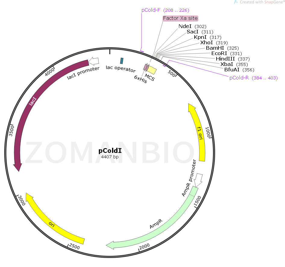 pColdI質粒是利用冷休克基因CSPA啟動子設計高效率蛋白質表達載體。在啟動子下游處,插入了lac操縱子,以便嚴格控制表達。此外,5’非翻譯區(qū)(5’UTR),翻譯增強元件(TEE),His標簽序列,Xa因子切割位點和多克隆位點(MCS)位于CAPS啟動子的下游。當培養(yǎng)溫度切換到低溫時,大腸桿菌暫時停止生長,大部分的大腸桿菌蛋白質表達減少,但是一類稱為冷休克蛋白的蛋白質被特異性誘導表達。