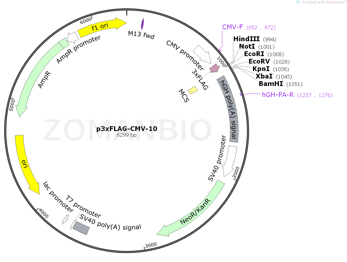p3×FLAG-CMV-10表達(dá)載體是用于在哺乳動(dòng)物細(xì)胞中建立N-3×FLAG融合蛋白的瞬時(shí)或穩(wěn)定細(xì)胞內(nèi)的pCMV5表達(dá)載體的升級(jí)版。該載體在多克隆區(qū)域上游編碼三個(gè)相鄰的FLAG表位(Asp-Tyr-Lys-Xaa-Xaa-Asp)。這導(dǎo)致使用FLAG抗體的檢測(cè)靈敏度增加。第三個(gè)FLAG表位包括腸激酶識(shí)別序列,允許從純化的融合蛋白切割3×FLAG肽。