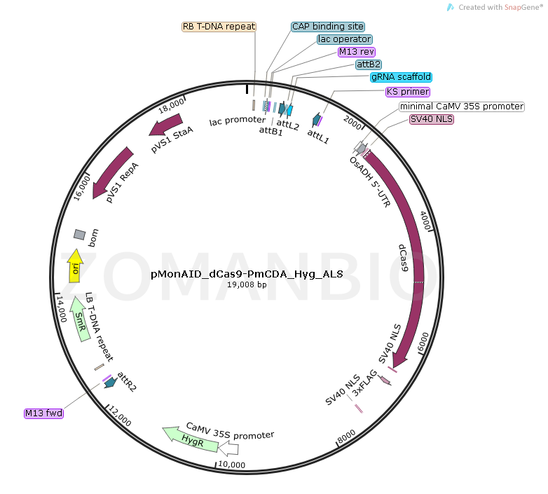 pMonAID_dCas9-PmCDA_Hyg_ALS是一個(gè)植物細(xì)胞dCAS9和gRNA表達(dá)質(zhì)粒。