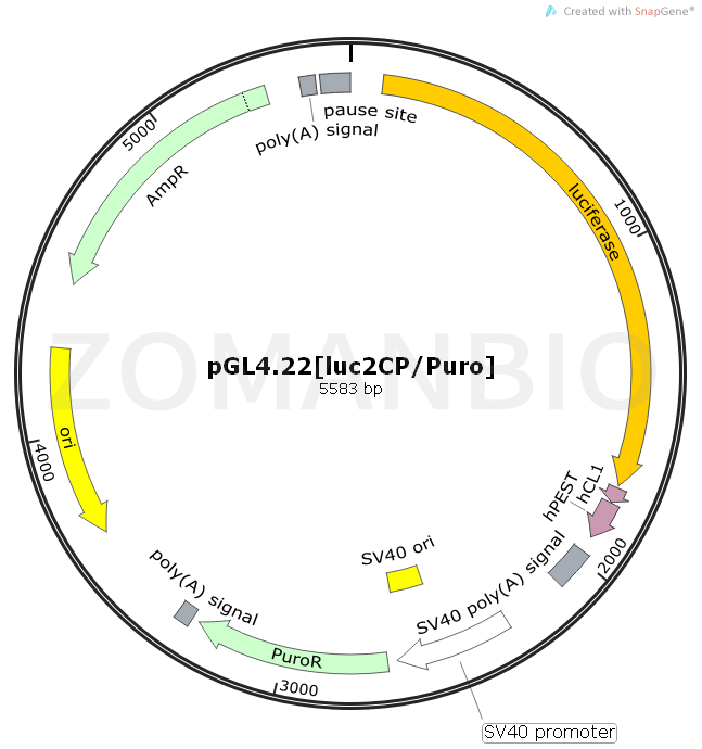 pGL4.22[luc2CP/Puro]是一個哺乳細胞單熒光素酶報告質粒。The pGL4.22[luc2CP/Puro] Vector encodes the luciferase reporter gene luc2CP (Photinus pyralis) and is designed for high expression and reduced anomalous transcription. This vector contains a mammalian selectable marker for puromycin resistance in which the number of transcription factor binding sites has been reduced and mammalian codon usage optimized. The vector is engineered with fewer consensus regulatory sequences for reduced background and a decreased risk of anomolous transcription and has a synthetic reporter gene, which has been codon optimized for mammalian expression. The pGL4.22[luc2CP/Puro] Vector is a basic vector with no promoter. However, it contains a multiple cloning region that allows cloning of a promoter of choice. The luc2CP reporter gene contains two protein destabilization sequences, hCL1 and hPEST. The protein encoded by luc2CP responds more quickly and with greater magnitude to changes in transcriptional activity than the luc2 gene, its more stable counterpart.
