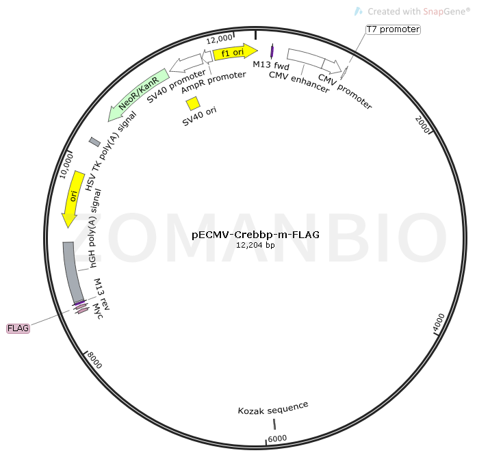 質粒序列可參考(具體以測序為準)下載:ZK6568 pECMV-Crebbp-m-FLAG小鼠基因質粒.txt